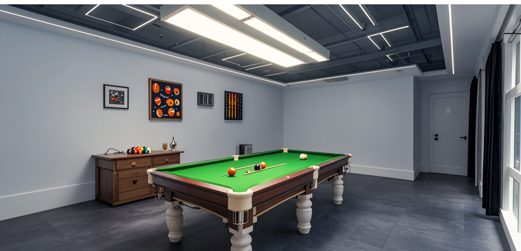 Rozložení osvětlení kulečníku by mělo zajistit rovnoměrné světlo a vyhnout se místně příliš jasné nebo příliš tmavé. Světelné proužky mohou být nainstalovány kolem kulečníku nebo na stropě, aby se zajistilo dostatečné světlo v rozích stolu. Aby se zabránilo oslnění, doporučuje se použít blokovaný světelný pruh nebo měkký světelný pás s difúzním filmem k zajištění rovnoměrného a měkkého světla.