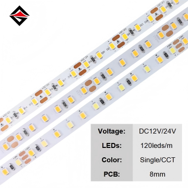 (2)Síla:Obvykle má světelný pás 24V větší výkon, protože vyšší napětí může řídit více LED světelných korálků.