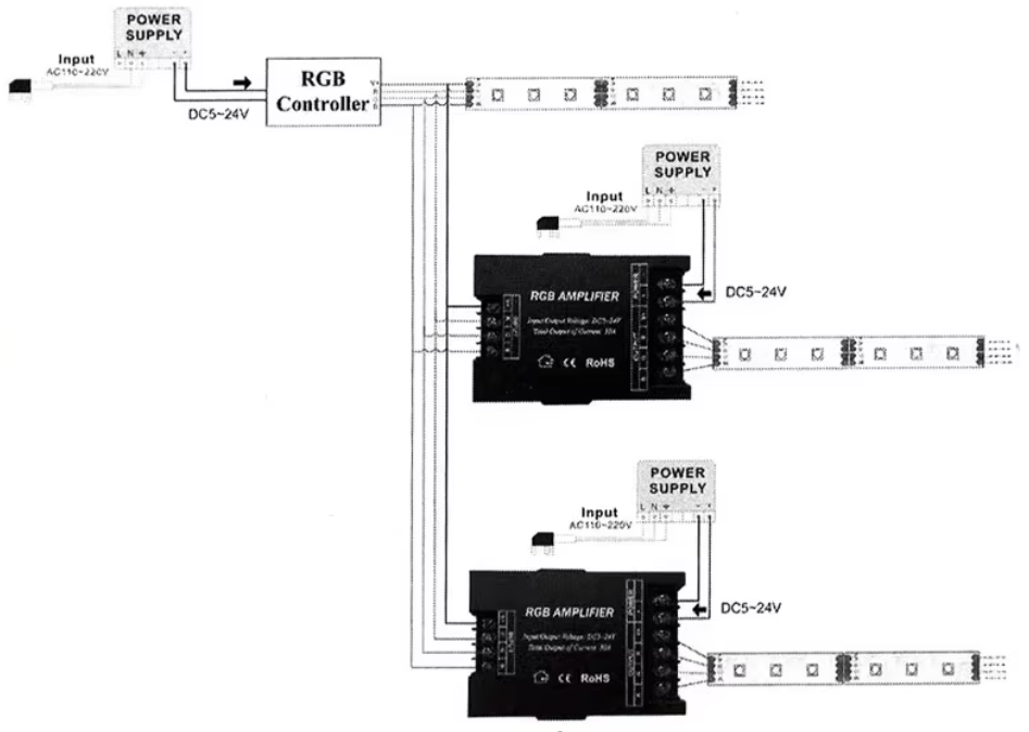 Nejprve připojte vstupní konec zesilovače k ovladači a poté připojte výstupní konec zesilovače k pásmu světla.