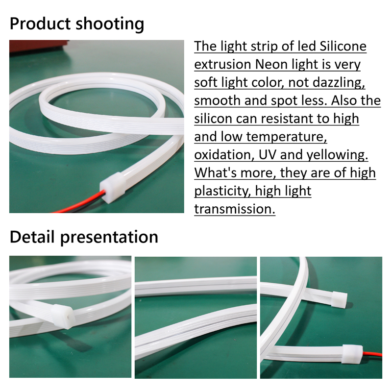 Použití jediného složení silikagelu s vysokou odolností proti teplotě, vodotěsným, ochranou proti UV a hořem, měkké a ekonomické a praktické. Vhodné pro osvětlení LED, dekorace nábytku, videohry a další scény.
